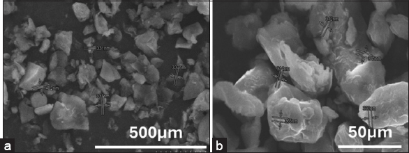 | Figure 2: (a and b) Scanning electron microscope of modified Ficus benghalensis fruit waste powder biosorbent. [Click here to view] |