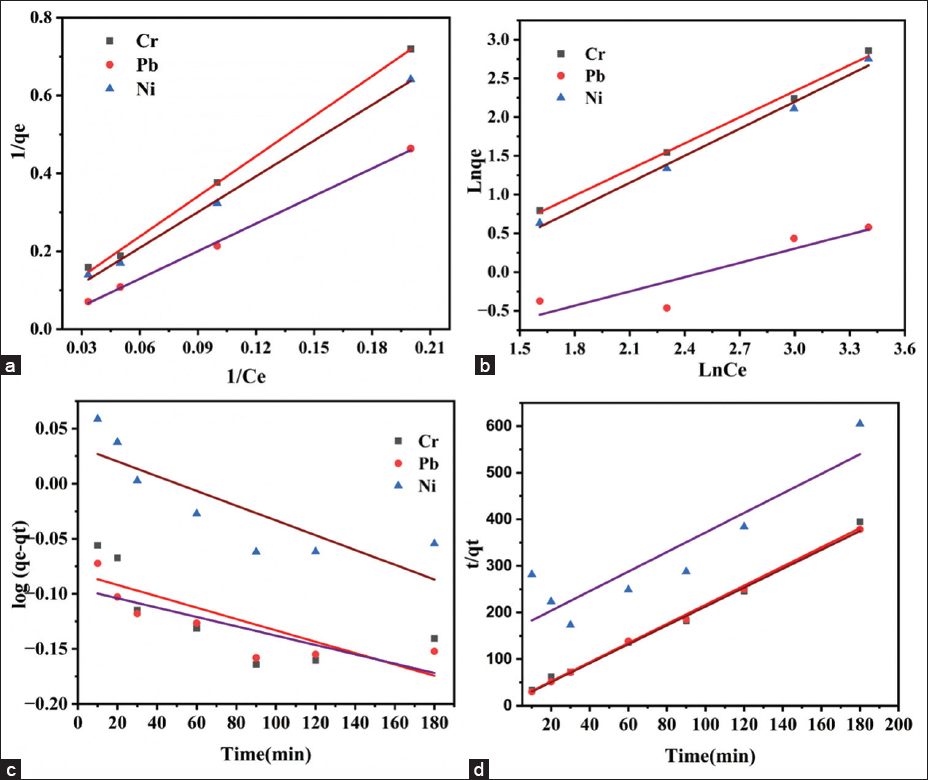 | Figure 6: Langmuir adsorption isotherm (a), Freundlich adsorption isotherm (b) (Fitted by linear regression) and Pseudo first-order kinetic model (c) Pseudo second-order kinetic model (d) of Cr, Pb and Ni uptake on the surface of Ficus benghalensis fruit waste powder biosorbent. [Click here to view] |