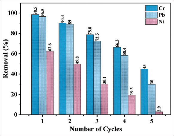 The regeneration study of the biosorbent provides an added advantage for bioremediation, particularly in wastewater treatment. In this study, 0.1M HCl was used as an eluent to recover Cr, Pb, and Ni from the loaded FBFWP biosorbent. It was observed that the biosorbent’s adsorption capacity decreased with repeated use. Despite this, the FBFWP biosorbent remained effective up to the second cycle for reducing Cr and Pb, but its efficiency significantly dropped after the third cycle. For Ni, the reusability of the FBFWP biosorbent proved inefficient after the first cycle, with further declines in performance, making regeneration impractical and not recommended. The weak retention of Ni suggests it may undergo leaching or a different desorption mechanism, reducing its adsorption efficiency over multiple cycles. In contrast, Cr and Pb form stronger chemical bonds with the biosorbent, ensuring stable adsorption and enabling efficient reusability over repeated cycles [34,35].