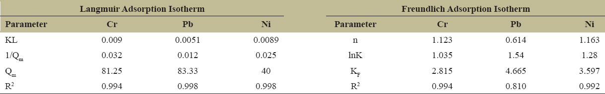Table 1: Characteristics of Langmuir and Freundlich adsorption Isotherms of FBFWP biosorbent to the uptake of Cr, Pb and Ni from aqueous solutions.
