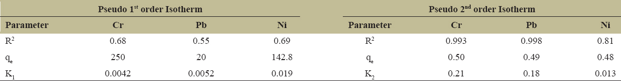 Table 2: Characteristic kinetics of Pseudo 1st order and Pseudo 2nd order models to of FBFWP adsorbent to the uptake of Cr, Pb and Ni from aqueous solutions.