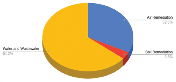 | Figure 4: Pie chart shows the distribution of nanomaterials production for environmental remediation of various categories, which include products, companies, and countries. [Click here to view] |