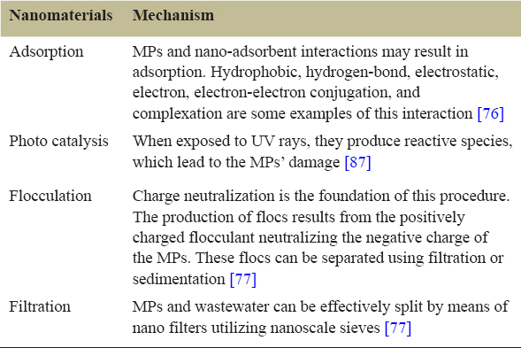 | Adsorption | MPs and nano-adsorbent interactions may result in adsorption. Hydrophobic, hydrogen-bond, electrostatic, electron, electron-electron conjugation, and complexation are some examples of this interaction [76] |
