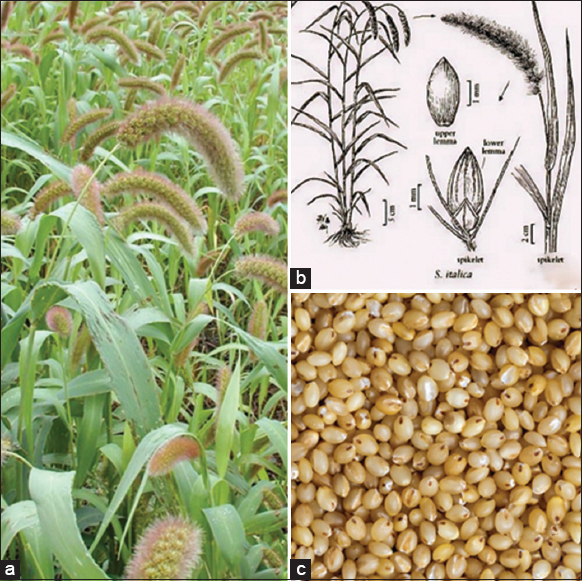 | Figure 2: (a) Foxtail millet plants with inflorescence. (b) Anatomical description of foxtail millet. (c) Foxtail millet grain. [Click here to view] |