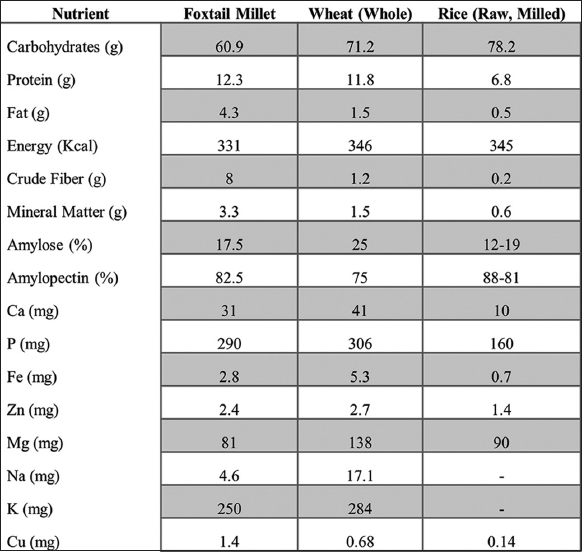 The nutritional composition of foxtail millet per 100 g [Figure 4]includes 60.9 g carbohydrates, 12.3 g protein, and 4.3 g fat, providing 331 kcal per serving. It also has 8 g crude fiber and 3.3 g mineral matter. The amylose content is 17.5%, while amylopectin is 82.5%. Additionally, it includes 31 mg calcium, 290 mg phosphorus, 2.8 mg iron, 2.4 mg zinc, 81 mg magnesium, 4.6 mg sodium, 250 mg potassium and 1.4 mg copper. Compared to major millet, foxtail millet surpasses them in all nutritional aspects, offering higher protein content, essential amino acids and sulfur-containing amino acids such as methionine and cysteine [42].