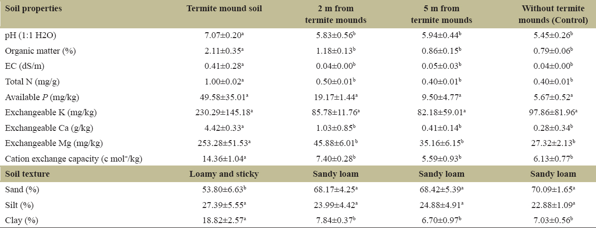 | Soil properties | Termite mound soil | 2 m from termite mounds | 5 m from termite mounds | Without termite mounds (Control) |
