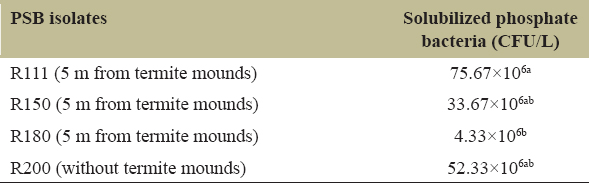 Table 3: Phosphate-solubilizing effectiveness of tested bacteria from the RD.6 field with and without termite mounds in Wang Saeng subdistrict, Chonnabot district, Khon Kaen province.