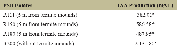 Table 4: Indole acetic acid production of PSB isolates from RD.6 field with and without termite mounds in Wang Saeng subdistrict, Chonnabot district, Khon Kaen province.