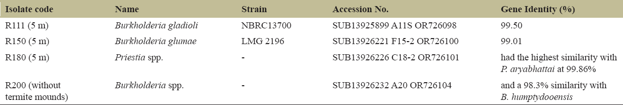 | R200 (without termite mounds) | Burkholderia spp. | - | SUB13926232 A20 OR726104 | and a 98.3% similarity with B. humptydooensis |