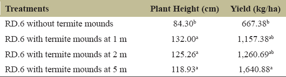 Table 6: Plant height and yield of RD.6 growing in the field without termite mounds and with termite mounds at distances of 1, 2, and 5 m in Wang Saeng subdistrict, Chonnabot district, Khon Kaen province.