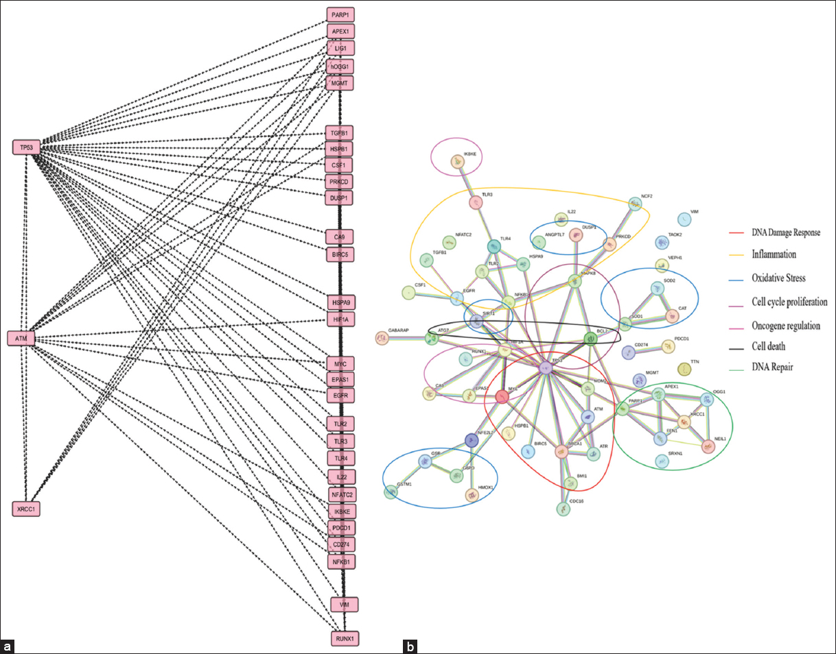 Breast cancer is the most common type of cancer in women diagnosed as of 2020, and it is the leading cause of cancer morbidity, disability, and mortality in women globally [14]. The RT remains a standard palliative therapy for curing breast cancer. The types of gene interactions may be categorized into gene regulatory networks, protein-protein interactions, regulation of gene expression, and crosstalk among pathways [15-17]. The coordinated cellular response to radiation depends on these gene-gene interactions, which affect the cancer patient’s response to RT. The genes represented in Figure 1 are known to be reported in previous literature, among which DNA repair and oxidative stress pathways are highly involved in RIAR. Also, the GSEA results comprising the genes and highly enriched pathways such as DNA repair and oxidative stress [Figure 2a-c] were in correlation with the gene-gene interaction results from Cytoscape (v 3.10.2) [Figure 3a] and STRING databases [Figure 3b]. p53 plays a main role in regulating other genes and is a major contributor for the occurrence of RIAR via seven major pathways [Figure 3b].