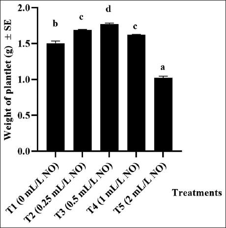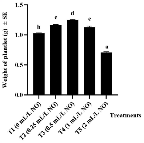 | Figure 1: Weight of in vitro plantlets in different neem oil (NO) treatments. [Click here to view] |