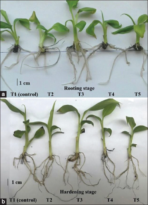 | Figure 2: The morphology of in vitro banana plantlets at the rooting stage (a) and hardening stage (b) after treatments with different neem oil (NO) concentrations (T1: 0 mL/L NO, T2: 0.25 mL/L NO, T3: 0.5 mL/L NO, T4: 1 mL/L NO, T5: 2 mL/L NO). [Click here to view] |