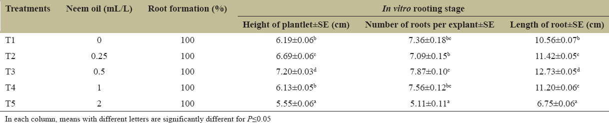 Table 1: Effects of various neem oil concentrations on in vitro shoot performance in the rooting stage (4 weeks of culture).