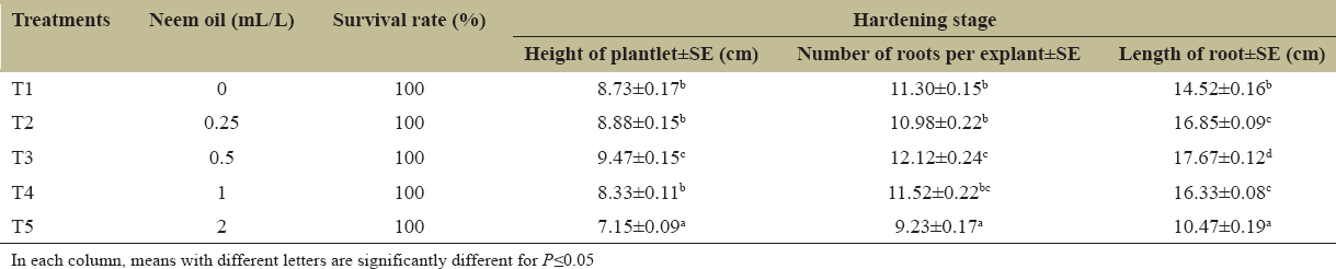 Table 2: Effects of various neem oil concentrations on in vitro plantlet performance in the hardening stage (4 weeks in greenhouse).
