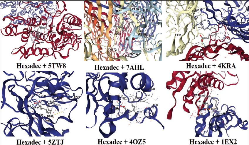 | Figure 2: Molecular docking of hexadecanoic acid with different target proteins. [Click here to view] |