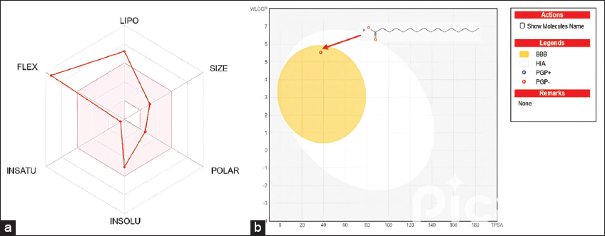 | Figure 3: (a) Physicochemical, pharmacokinetic, lipophilicity, drug-likeness, and medicinal chemistry properties of hexadecanoic acid. (b) Boiled egg plot between lipophilicity and polarity showing hexadecanoic acid physicochemical properties favorable for both blood-brain barrier penetration and high intestinal absorption. [Click here to view] |