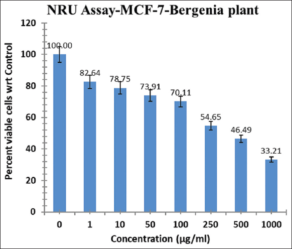 The NRU Assay findings for MCF-7 breast cancer cells treated with several doses of the Bergenia plant extract are shown in the graph. 100% of the cells in the control group (0 µg/mL) are viable. Cell viability declines with increasing extract concentration, suggesting a dose-dependent cytotoxic impact. At lower doses (1–100 µg/mL), cell viability gradually declines: 82.64% at 1 µg/mL and 70.11% at 100 µg/mL. At doses between 250 and 1000 µg/mL, cell viability dramatically declines: 54.65% at 250 µg/mL and 33.21% at 1000 µg/mL. The trend indicates that the cytotoxic effects of the Bergenia plant extract on MCF-7 cells are concentration-dependent [Figure 5]. Stronger cytotoxic effects at higher doses point to possible anticancer qualities. For example, the plant extract’s IC50 is 317.9 ± 0.12 µg/mL.