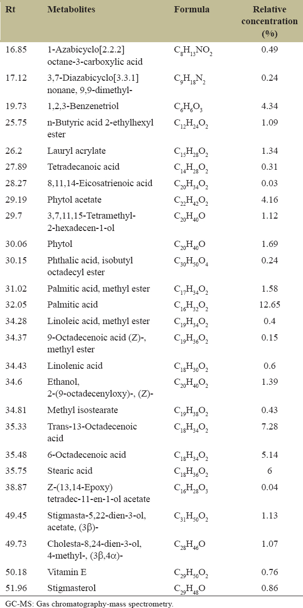 | 29.19 | Phytol acetate | C22H42O2 | 4.16 |