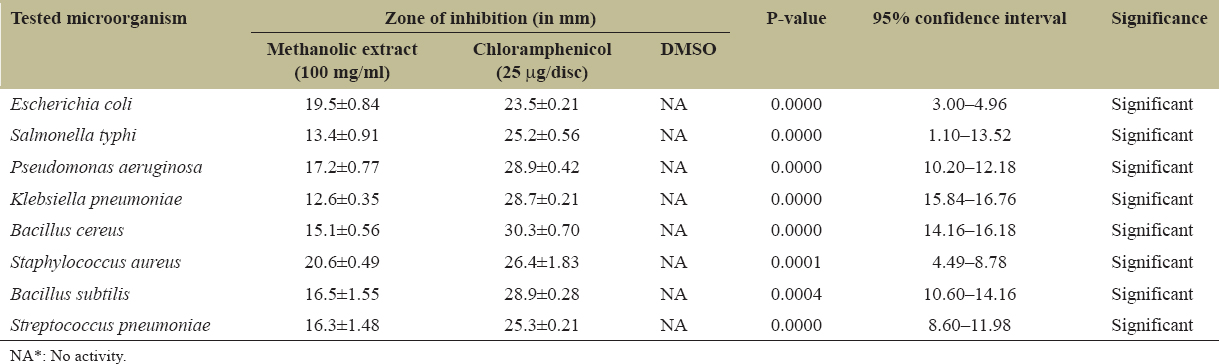 | Tested microorganism | Zone of inhibition (in mm) | P-value | 95% confidence interval | Significance | ||