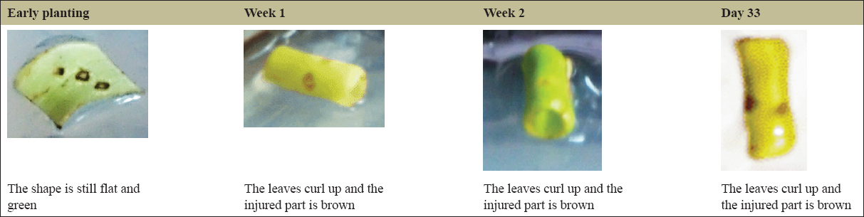 The variation in PGRs that provided the best development of the explants was found to be NAA: BAP (1.5:10 mg/L), 2,4-D-Kinetin (2:2 mg/L), 2,4-D: Pineapple extract (0.5:15000 mg/L), IBA: Kinetin (0.5:1 mg/L), and the control without PGRs. The leaf explants without PGR treatment, serving as the control, on day 33 displayed curling and a yellowish-green color [Figure 1]. The development of the explants using the PGR NAA: BAP (1.5:10 mg/L) on day 98 showed that the leaves were nearly curled, and the upper surface of the leaves appeared white, with no callus formation observed [Figure 2]. In the case of the leaf explants treated with the 2,4-D-Pineapple extract (0.5 mg/L:15%) on day 68, the campus leaves had not undergone any morphological changes, although the leaf color had faded [Figure 3]. The results of tissue culture using the PGR 2,4-D-Kinetin (2:2 mg/L) on day 33 indicated that the leaf explants were curling and the callus was brown [Figure 4]. The leaf explants treated with the medium containing IBA-kinetin (0.5: 1 mg/L) on day 41 exhibited curling, accompanied by brown callus [Figure 5].