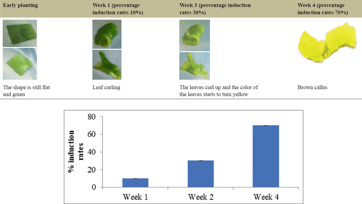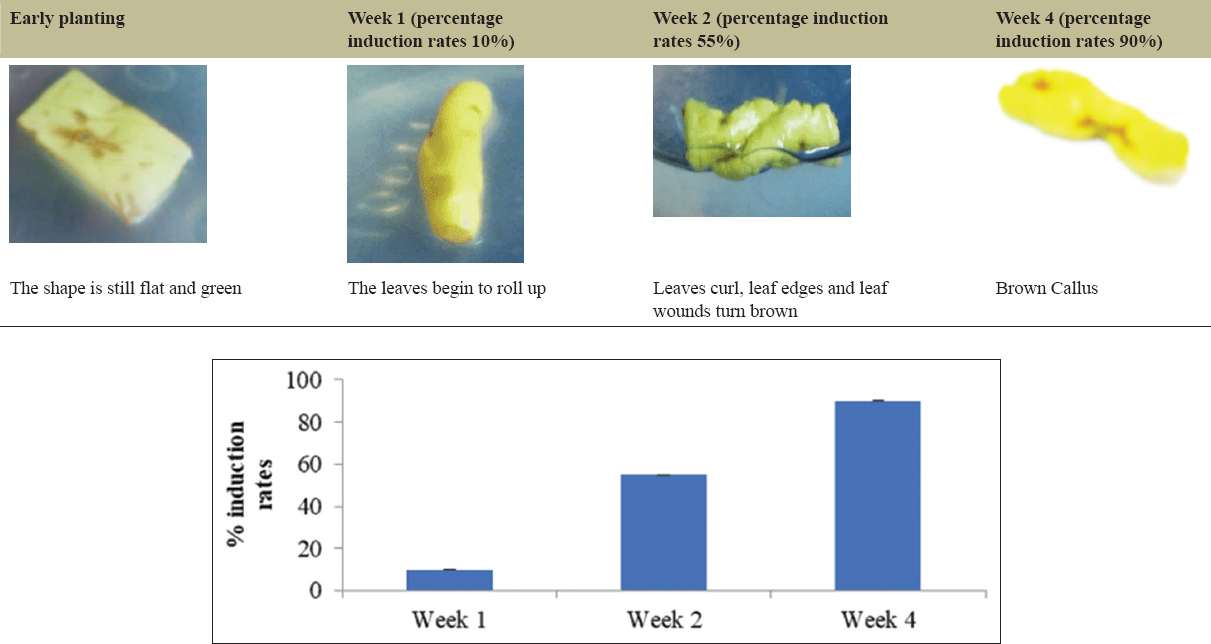 | Figure 3: The growth of Nampu leaf explants on Murashige and Skoog medium + 2.4 D: Pineapple extract (0.5:15000 mg/L). [Click here to view] |