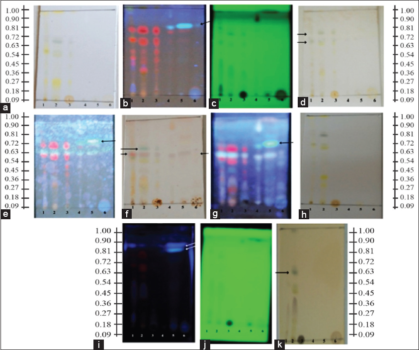 | Figure 8: Thin layer chromatography using the mobile phase n-hexane: ethyl acetate (7:3) on PGR 2.4D: Pineapple extract. 1: N-hexane extract, 2: Ethyl acetate extract, 3: Methanol extract, 4: N-hexane extract of nampu leaves from tissue culture, 5: Ethyl acetate extract of nampu leaves from tissue culture, 6: Methanol extract of nampu leaves from tissue culture, (a) Visual, (b) ultraviolet (UV) 365 nm, (c) UV 254 nm, (d) H2SO4 spot appearance (Visual), (e) H2SO4 spot appearance (UV 365 nm), (f) Lieberman–Burchard spot appearance (Visual), (g) Lieberman–Burchard spot appearance (UV 365 nm), (h) Citroborate spot appearance (Visual), (i) Citroborate spot appearance (UV 365 nm), (j) Citroborate spot appearance (UV 254 nm), (k) FeCl3 spot appearance (Visual). [Click here to view] |