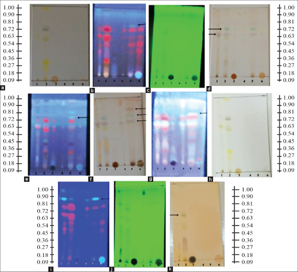 | Figure 7: Thin layer chromatography using the mobile phase n-hexane: ethyl acetate (7:3) in NAA: BAP. 1: N-hexane extract, 2: Ethyl acetate extract, 3: Methanol extract, 4: N-hexane extract of nampu leaves from tissue culture, 5: Ethyl acetate extract of nampu leaves from tissue culture, 6: Methanol extract of nampu leaves from tissue culture, (a) Visual, (b) ultraviolet (UV) 365 nm, (c) UV 254 nm, (d) H2SO4 spot appearance (Visual), (e) H2SO4 spot appearance (UV 365 nm), (f) Lieberman–Burchard spot appearance (Visual), (g) Lieberman–Burchard spot appearance (UV 365 nm), (h) Citroborate spot appearance (Visual), (i) Citroborate spot appearance (UV 365 nm), (j) Citroborate spot appearance (UV 254 nm), (k) FeCl3 spot appearance (Visual). [Click here to view] |