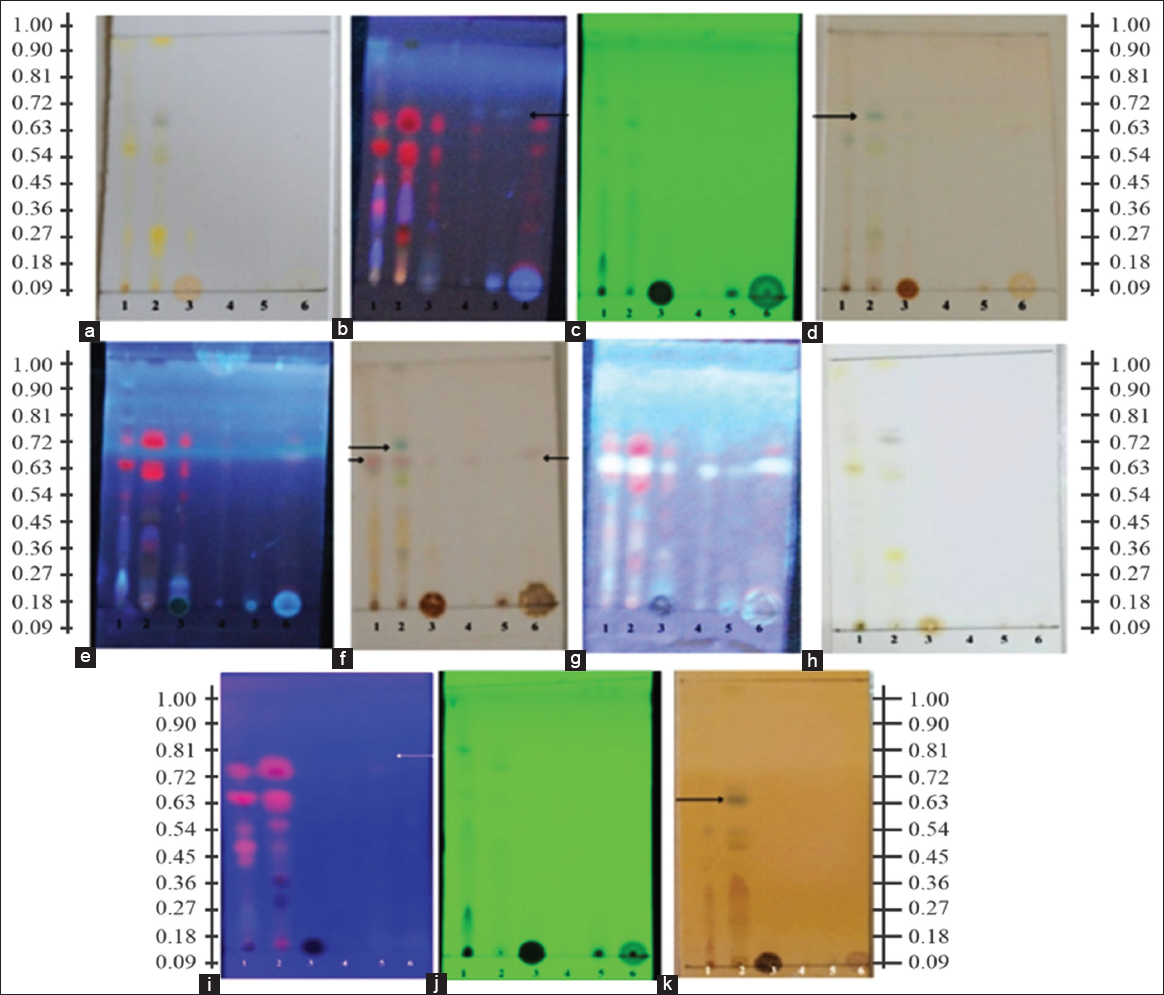 | Figure 6: Thin layer chromatography results using the mobile phase n-hexane: ethyl acetate (7:3) in the control (MS medium). 1: N-hexane extract, 2: Ethyl acetate extract, 3: Methanol extract, 4: N-hexane extract of nampu leaves from tissue culture, 5: Ethyl acetate extract of nampu leaves from tissue culture, 6: Methanol extract of nampu leaves from tissue culture. (a) Visual, (b) ultraviolet (UV) 365 nm, (c) UV 254 nm, (d) H2SO4 spot appearance (Visual), (e) H2SO4 spot appearance (UV 365 nm), (f) Lieberman–Burchard spot appearance (Visual), (g) Lieberman–Burchard spot appearance (UV 365 nm), (h) Citroborate spot appearance (Visual), (i) Citroborate spot appearance (UV 365 nm), (j) Citroborate spot appearance (UV 254 nm), (k) FeCl3 spot appearance (Visual). [Click here to view] |