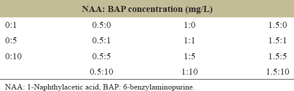 The growth hormones (PGRs) used in this study included NAA and BAP [Tables 1-4].