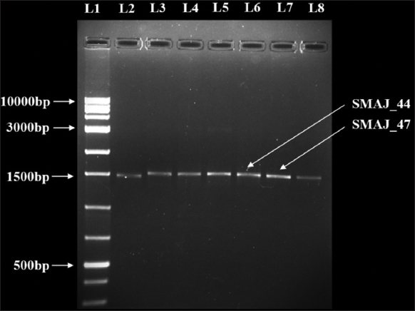 For molecular identification and characterization, the genomic DNA of two bacterial strains, PCR amplification was performed targeting the 16S rRNA gene for molecular identification of the bacterial isolates using the universal primers 27F 5’-AGAGTTTGATCGTGGCTCAG-3’ and 1492R 5’-CGGTTACCTTGTTACGACTT-3’ purchased from IDT (Integrated DNA Technologies) [24]. Both the forward and reverse primers were added to the 50 µL of reaction mixture containing 1× reaction buffer including 1.5 mM MgCl2, 0.2 µM of each of the forward and reverse primers, 0.2 mM dNTP, 5 µL of the template DNA, water to a final volume of 50 µL, and 1.25 U of Taq DNA polymerase. The following PCR program was used: An initial denaturation at 94°C for 5 min, followed by 30 cycles of 94°C for 30 s, 55°C for 30 s, and 72°C for 60 s, and a final extension at 72°C for 10 min. All of the aforementioned chemicals were procured from BioBharati LifeScience Pvt. Ltd. (Kolkata, India) [25]. A sample containing sterile water instead of DNA was used as a negative control. The PCR reactions were carried out in a T 100™ Thermal cycler (BioRad). The size of the amplified products was visualized and determined in a 1% agarose gel stained with ethidium bromide in 1× Tris-acetate-ethylenediaminetetraacetic acid buffer at 75V for 35–40 min and using a DNA Ladder (ProxiO 1 kb DNA Ladder plus cat. #93406, SRL). The gel images were captured in ultraviolet transillumination with Gel Doc™ XR+ imaging system (Bio-Rad, USA) [Figure 2].