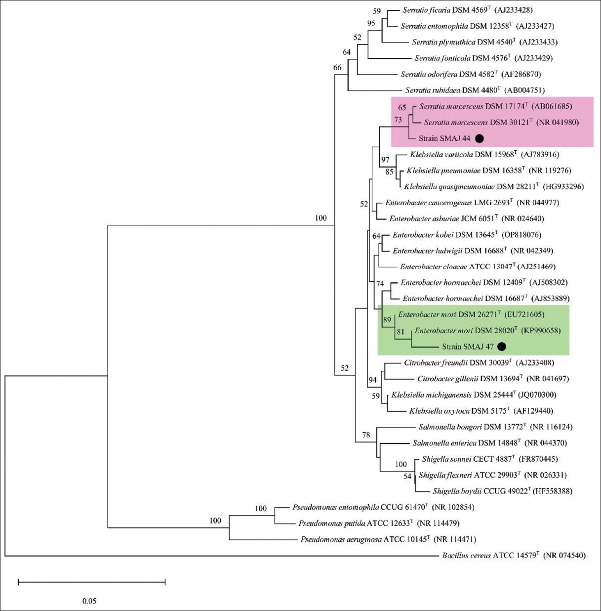 | Figure 3: Phylogenetic tree illustrating the position of strains SMAJ_44 and SMAJ_47, with a black circle (•). The clades for both strains are highlighted. Evolutionary distances were calculated using the maximum composite likelihood, and the topology was inferred using the neighbor-joining method using MEGA 11. Bootstrap values >50% based on 1000 replicates are indicated as percentages at the nodes of the tree. The scale bar represents 0.05 substitutions per nucleotide site. Bacillus cereus was arbitrarily chosen as the outgroup. [Click here to view] |