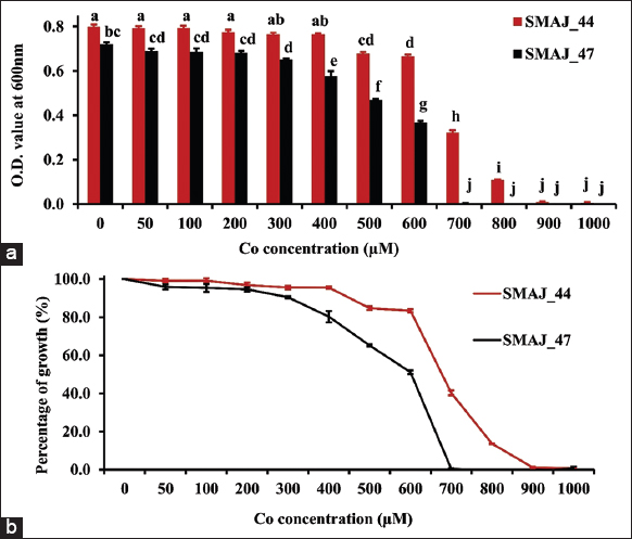 | Figure 5: (a) Growth response of strains SMAJ_44 and SMAJ_47 in LB broth under cobalt stress, (b) Percentage of growth in LB broth under cobalt stress. Values are expressed as means ± standard error. Different letters denote significant differences between treatments (P < 0.05) according to One-way analysis of variance with Tukey’s post hoc multiple comparison test. [Click here to view] |