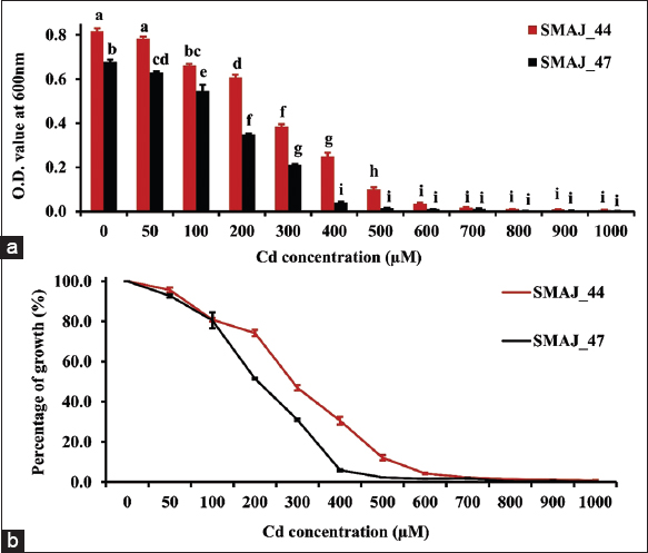 | Figure 6: (a) Growth response of strains SMAJ_44 and SMAJ_47 in LB broth under cadmium stress, (b) percentage of growth in LB broth under cadmium stress. Values are expressed as means ± standard error. Different letters denote significant differences between treatments (P < 0.05) according to One-way analysis of variance with Tukey’s post hoc multiple comparison test. [Click here to view] |