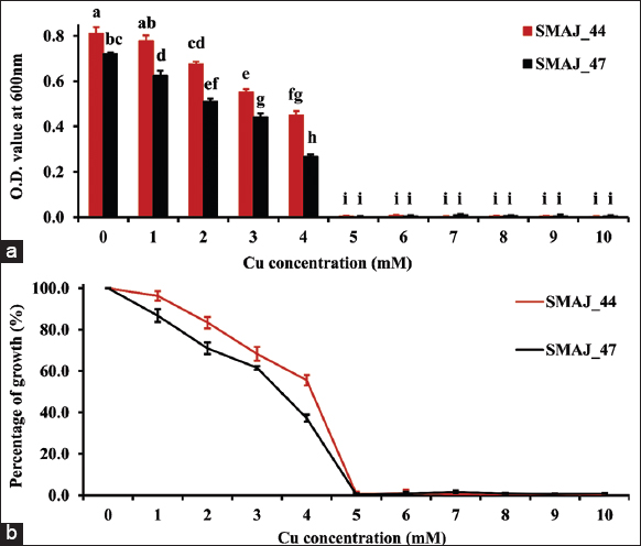 | Figure 7: (a) Growth response of strains SMAJ_44 and SMAJ_47 in LB broth under copper stress, (b) Percentage of growth in LB broth under copper stress. Values are expressed as means ± standard error. Different letters denote significant differences between treatments (P < 0.05) according to One-way analysis of variance with Tukey’s post hoc multiple comparison test. [Click here to view] |