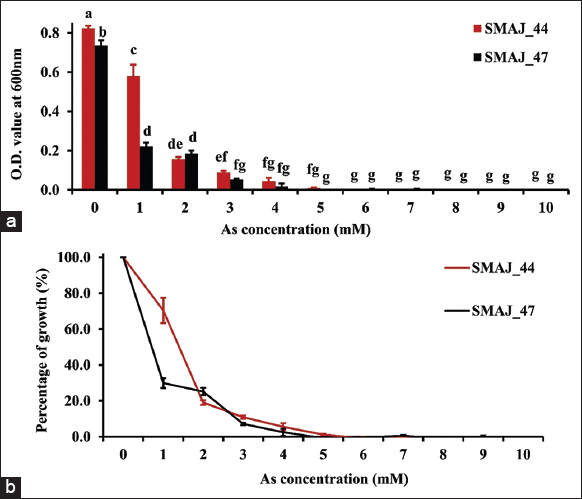 | Figure 8: (a) Growth response of strains SMAJ_44 and SMAJ_47 in LB broth under arsenic stress, (b) Percentage of growth in LB broth under arsenic stress. Values are expressed as means ± standard error. Different letters denote significant differences between treatments (P < 0.05) according to One-way analysis of variance with Tukey’s post hoc multiple comparison test. [Click here to view] |