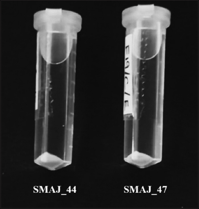 | Figure 12: Exopolysaccharides production by bacterial strains SMAJ_44 and SMAJ_47 was obtained from 25 mL LB broth. [Click here to view] |