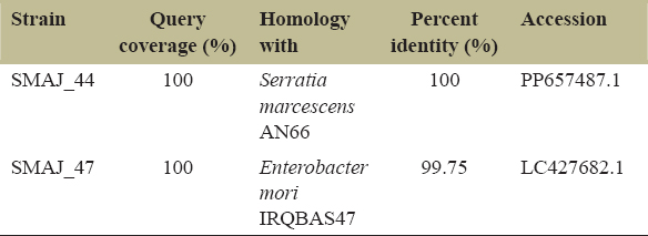 Table 2: Bacterial strains with their query coverage, top-hit taxonomy (homologous sequence), percent identity, and NCBI accession number.