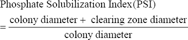 To determine the P-solubilization ability to solubilize sparingly soluble inorganic phosphate, strains were screened for clear phosphate-solubilizing zones around the colonies after 5 days of incubation at 28 ± 2°C on the agar plates with NBRIP (National Botanical Research Institute’s Phosphate) medium consisting of glucose (10 g/L), (NH4)2SO4 (0.1 g/L), MgSO4•7H2O (0.25 g/L), KCl (0.2 g/L), MgCl2•6H2O (5.0 g/L), Ca3(PO4)2 (5 g/L) and agar (15 g/L) [43]. The diameter of the bacterial colony and the halo zone were measured on the 5th day and then were used to evaluate the Phosphate Solubilization Index (PSI) according to the equation below [44].