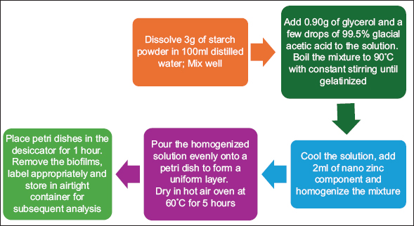 3 g of starch powder was added to 100 mL of distilled water and stirred until completely dissolved. To this solution, 0.90 g of glycerol and a few drops of 99.5% glacial acetic acid were added and the solution was boiled to 90°C with constant stirring until gelatinized. The solution was then cooled and 2 mL of nano zinc component was added to it and the mixture was homogenized. The homogenized solution was poured onto a petri dish to create a uniform layer, which was then dried in a hot air oven at 60°C for 5 h. After drying, the petri dishes were removed from the oven and positioned in a desiccator for an hour. The biofilms were then carefully removed from the petri dishes, labeled appropriately, and stored in an airtight container for subsequent analysis [Figures 2 and 3; Table 1].