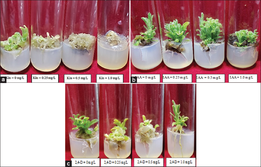 Table 1: Shoot induction response in Iphigenia stellata at different concentrations of BAP, Kn, and TDZ.