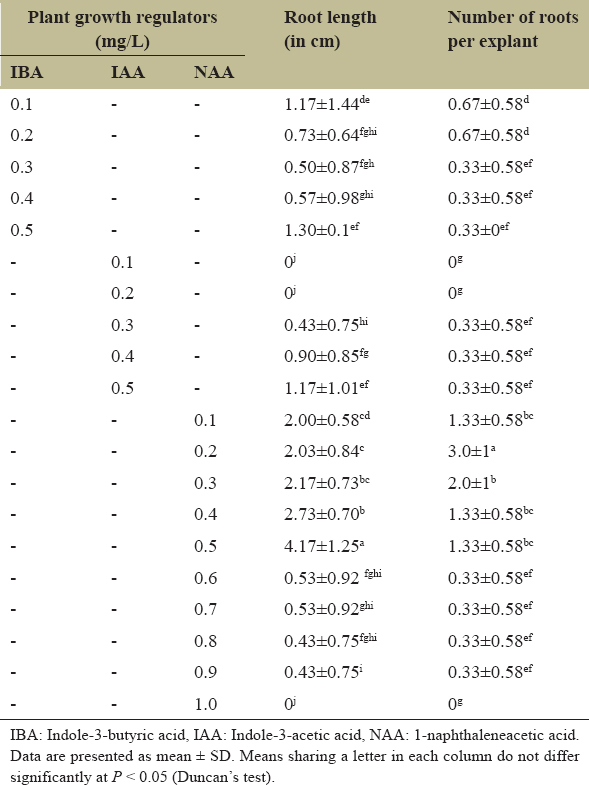 Well-developed shoots were transferred onto the root induction medium containing MS fortified with auxins (NAA, IBA, and IAA) at the concentrations mentioned above, of which 0.2 mg/L NAA induced the highest number of roots [Figure 2d]. Nonetheless, maximum root length was observed in the medium with an NAA concentration of 0.5 mg/L [Table 2]. Similar results have been reported for NAA but in combination with IBA in I. indica [18].