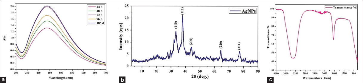 | Figure 3: Characterization: (a) Ultraviolet-visible spectroscopic analysis, (b) X-ray diffraction pattern, (c) Fourier-transform infrared spectrum of silver nanoparticles. [Click here to view] |