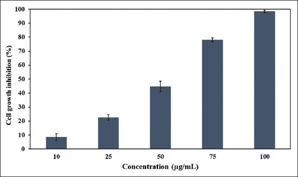 The cytotoxic potential of the synthesized AgNPs was evaluated against the human breast adenocarcinoma MCF-7 cell line using the MTT assay. Cells treated with increasing concentrations of AgNPs (10–100 μg) for 24 h demonstrated a clear, dose-dependent inhibition of cell viability. At the lowest tested dose (10 μg), a modest inhibition of 8.53±±±2.40% was observed, indicating limited cytotoxicity. As the concentration increased, cell viability declined progressively, reaching 98.58 ± 0.94% inhibition at 100 μg, indicating near-complete cytotoxicity and a strong dose–response relationship [Figure 6]. Statistical analysis using one-way ANOVA revealed a highly significant difference between treatment groups (F = 242.67, P < 0.0001), validating the observed trend.