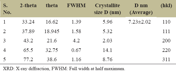 XRD analysis was used to determine the crystalline structure and size of the synthesized AgNPs. The diffraction pattern displayed distinct peaks at 2θ values [Figure 3b] corresponding to the (110), (111), (200), (220), and (311) planes, indicative of a face-centered cubic (FCC) structure (JCPDS No. 04–0783). The average crystallite size was calculated using the Debye-Scherrer equation D = 0.9k/β cos θ, based on the full width at half maximum, Bragg’s angle (θ), and X-ray wavelength (λ). The estimated crystallite sizes ranged from 2.03 to 14.09 nm, with a mean size of 7.23 ± 2.02 nm [Table 5].