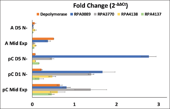 | Figure 2: Fold change of the four predicted phasins (RPA0089, RPA3770, RPA4137, and RPA4138) and PHB depolymerase from Rhodopseudomonas palustris cells grown on p-Coumarate and acetate (a) at mid-exponential (Mid Exp), 1 day past nitrogen starvation (D1 N-), and 5 days past nitrogen starvation (D5 N-). All experiments were conducted with at least three biological replicates and five technical replicates. P < 0.05 was applied to filter statistically significant results. Error bars are the calculated standard deviations based on the population. [Click here to view] |