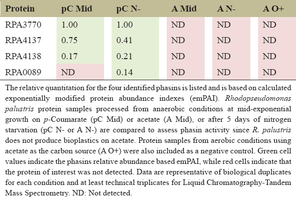 The relative quantitation for the four identified phasins is listed and is based on calculated exponentially modified protein abundance indexes (emPAI). Rhodopseudomonas palustris protein samples processed from anaerobic conditions at mid-exponential growth on p-Coumarate (pC Mid) or acetate (A Mid), or after 5 days of nitrogen starvation (pC N- or A N-) are compared to assess phasin activity since R. palustris does not produce bioplastics on acetate. Protein samples from aerobic conditions using acetate as the carbon source (A O+) were also included as a negative control. Green cell values indicate the phasins relative abundance based emPAI, while red cells indicate that the protein of interest was not detected. Data are representative of biological duplicates for each condition and at least technical triplicates for Liquid Chromatography-Tandem Mass Spectrometry. ND: Not detected.