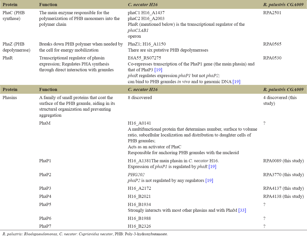 Thus, it is likely that the four phasins employed by R. palustris that were identified in this study have particular roles and relationships with other GAPs. This study provides the foundation for further elucidation of PHA metabolism in R. palustris to: