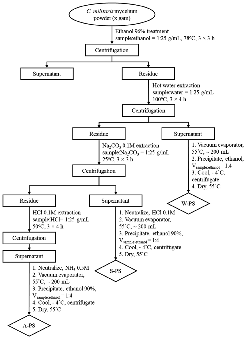| Figure 1: Flow chart of polysaccharide sequential extraction procedure from Cordyceps militaris mycelium. W-PS: Water extraction; S-PS: Na2CO3 extraction, and A-PS: HCl extraction. [Click here to view] |