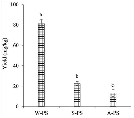 | Figure 2: Yield of polysaccharides (PS) extracted from Cordyceps militaris mycelium. W-PS (water), A-PS (HCl), and S-PS (Na2CO3) extracts. Significant differences are indicated by different letters (Tukey’s Honestly Significant Difference, P < 0.05). [Click here to view] |